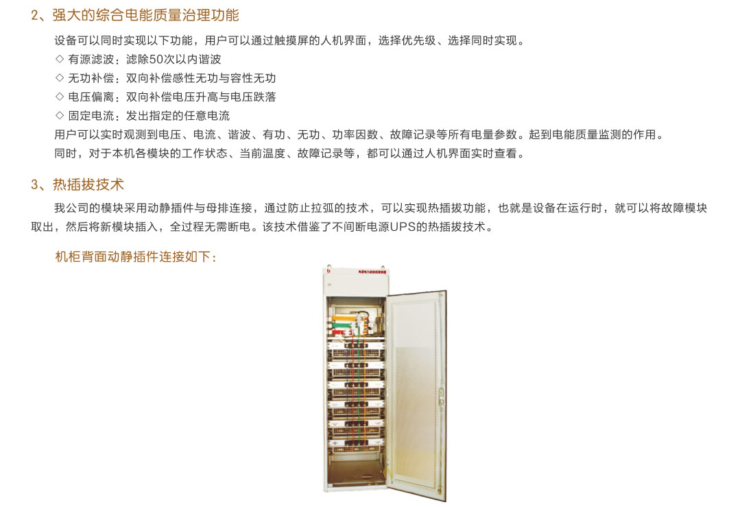 The main circuit of the complete set of active power filter device is an IGBT power converter, which adopts the detection technology of instantaneous reactive power theory to automatically track the harmonic changes of the power grid, and has a high degree of controllability and rapid response. It overcomes the shortcomings of poor filtering effect of traditional passive filtering devices, prone to resonance, and can only compensate for fixed sub-harmonics, and can play a good filtering and compensation effect on various fast transient impact loads.