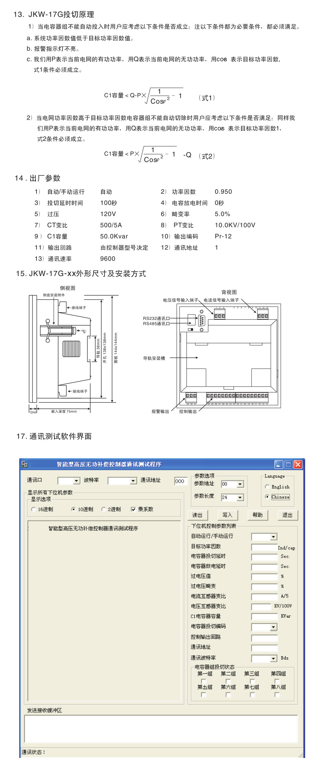 JKW-17G high-voltage no-power automatic compensation controller is suitable for automatic adjustment of capacitor compensation devices in high-voltage distribution systems, so that the power factor can reach the user's predetermined state, improve the utilization efficiency of power transformers, reduce line losses, and improve the voltage quality of power supply.