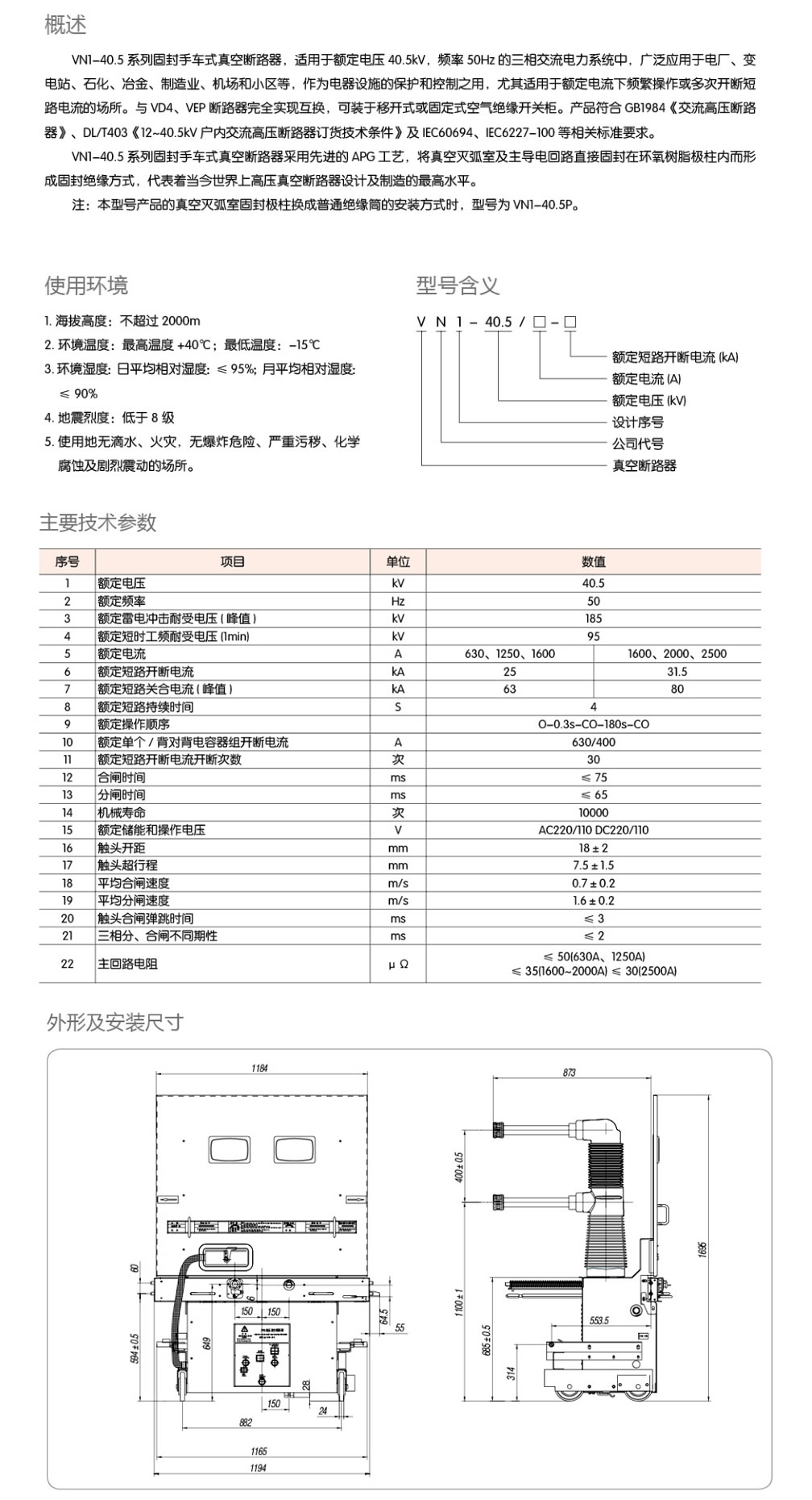 VN1-40.5 series solid-sealed handcart type high-voltage vacuum circuit breakers are suitable for three-phase AC power systems with a rated voltage of 40.5kv and a frequency of 50Hz. They are widely used in power plants, substations, petrochemicals, metallurgy, manufacturing, airports and communities, etc. As the protection and control of electrical facilities, it is especially suitable for places with frequent operation under rated current or multiple interruption of short-circuit current. It is completely interchangeable with VD4 and VEP circuit breakers, and can be installed in mobile or fixed air-insulated switch cabinets.