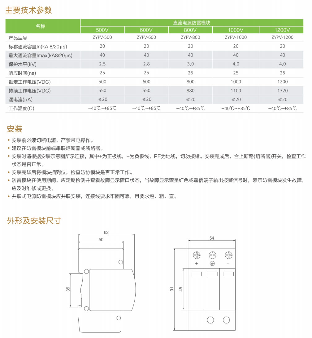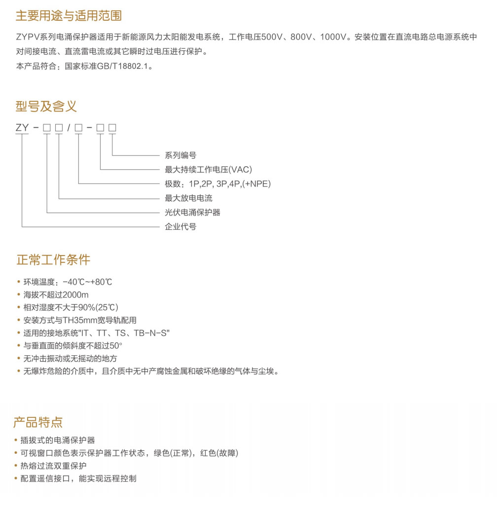 Zypv photovoltaic series surge protectors are suitable for new energy wind and solar power generation system with working voltage of 500V, 800V and 1000V. The installation position is in the main power supply system of DC circuit to protect indirect current, DC lightning current or other instantaneous overvoltage.