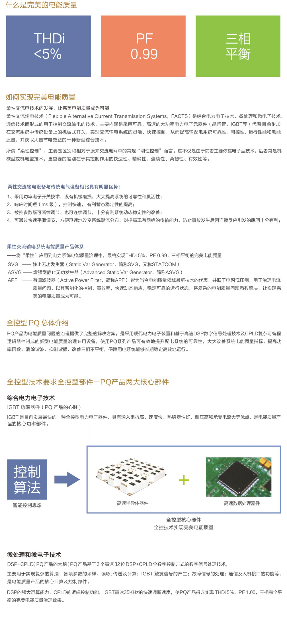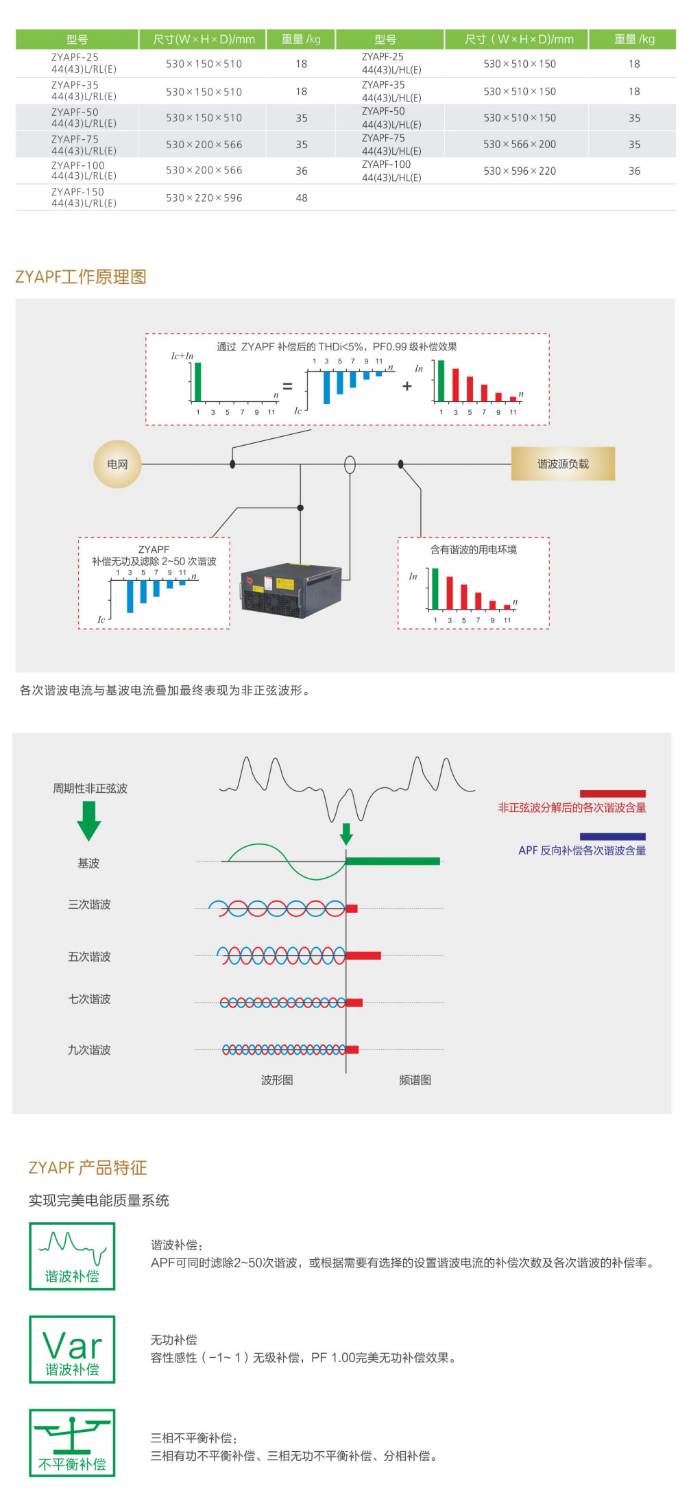 The active power filter detects the load current in real time through the external current transformer CT, extracts the harmonic component of the load current through the internal DSP calculation, and then sends the PWM signal to the internal IGBT to control the inverter to generate a current with the same size and opposite direction as the load harmonic, and injects it into the power grid to compensate the harmonic current, so as to realize the filtering function.