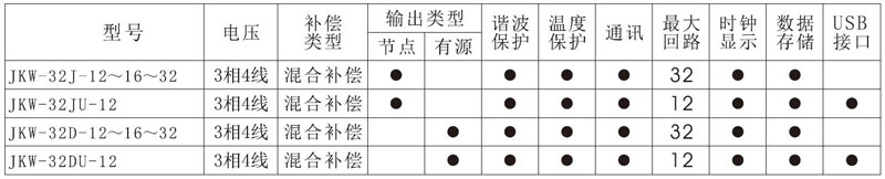 JKW-32系列配電監測計量終端,以高性能的32位微處理器為核心器件同時(shí)取3相電壓3相電流信號,最多提供32個(gè)控制回路(32回路型為終端主機提供12回路,回路擴展器提供12或20回路)。終端提供全分補、全共補、共補加分補3種補償方案,同時(shí)提供12種電容器組投切方法(輸