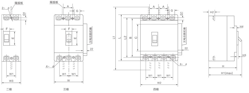 A型N極不安裝過(guò)電流脫扣元件,且N極始終接通,不與其它三級一起合分;