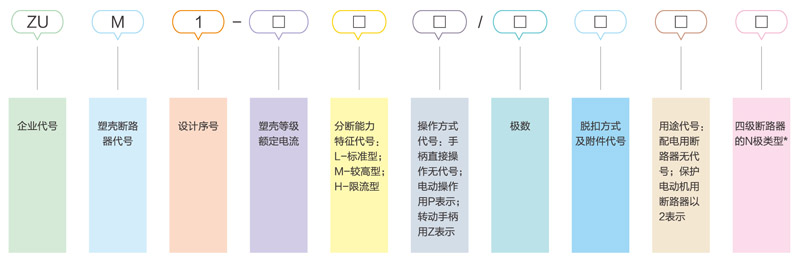 產(chǎn)品型號+內部附件代號(分勵及欠壓需注明額定工作電壓)+配電用不寫(xiě),電動(dòng)機保護用加Z+電操(P),手柄Z(無(wú)時(shí)不寫(xiě))+內部附件額定電壓代號(無(wú)時(shí),用00表示)。