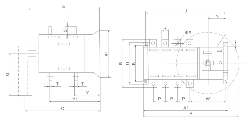 | 電流 | A | A1 | B | B1 | C | E | G | J | K | L | N | P | R | S | T | U | W | фX | Y | Y1 |