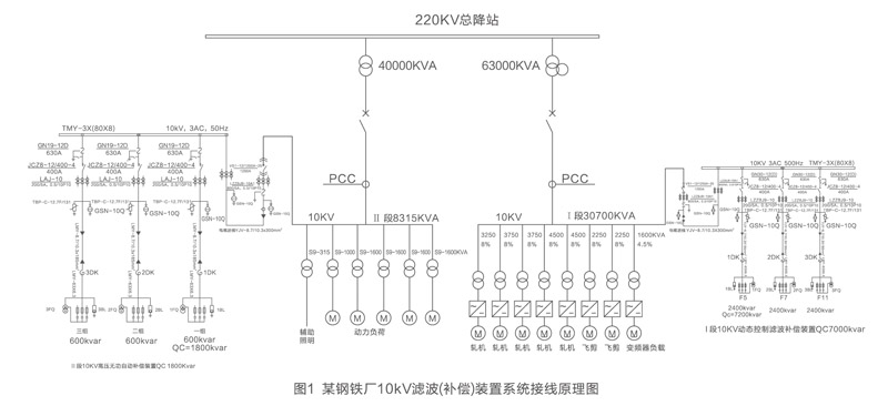 本裝置主要安裝在6kV、10kV、35kV母線(xiàn)側,適用于電力系統、冶金、鋼鐵、鋁廠(chǎng)、石油、化工、電氣化鐵路、造紙、造船等諧波電流大的場(chǎng)所,如(圖1)為某鋼鐵廠(chǎng)10kV濾波(補償)裝置系統接線(xiàn)原理圖。