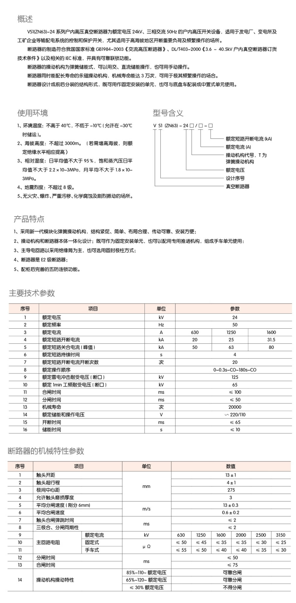 VS1(ZN63)-24系列戶(hù)內高壓真空斷路器為額定電壓為24kv、三項交流50Hz的戶(hù)內高壓開(kāi)關(guān)設備,適用于發(fā)電廠(chǎng)、變電所及工礦企業(yè)等輸配電系統的控制和保護開(kāi)關(guān),尤其適用于高海拔地區開(kāi)斷重要負荷及頻繁操作的場(chǎng)所。