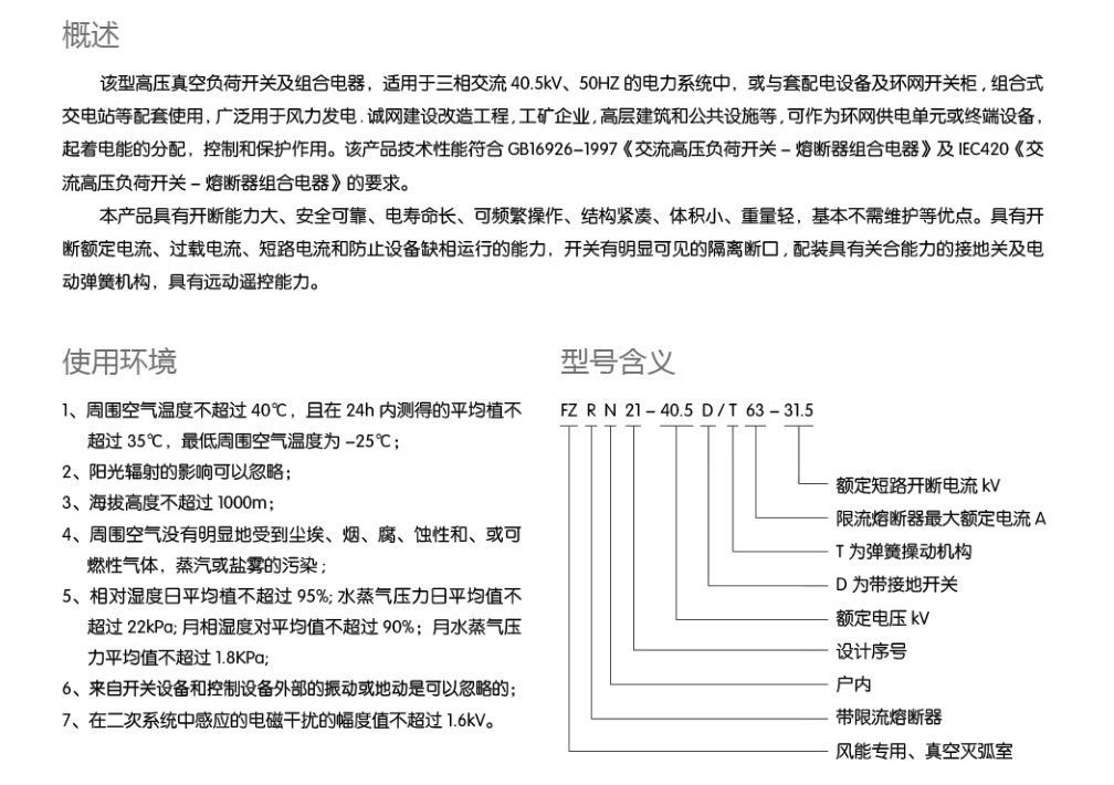該型高壓真空式負荷開(kāi)關(guān)及組合電器,適用于三相交流40.5kv、50Hz的電力系統中,或與套配電設備及環(huán)網(wǎng)開(kāi)關(guān)柜,組合式交電站等配套使用,廣泛用于風(fēng)力發(fā)電、城網(wǎng)建設改造工程,工礦企業(yè),高層建筑和公共設施等,可作為環(huán)網(wǎng)供電單元或終端設備,起著(zhù)電能的分配,控制和保護作用。